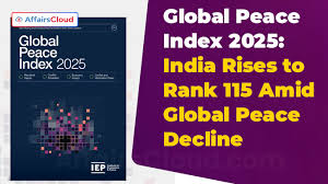 The Global Peace Index (GPI) 2025, compiled by the Institute for Economics and Peace (IEP), ranked 163 countries, covering 99.7% of the world’s population. Iceland retained the top spot as the most peaceful country in the world, a position it has consistently held since 2008, due to low crime, strong social trust, and absence of an army. India ranked 115th with a GPI score of 2.229, showing a 0.58% improvement in peacefulness compared to last year.